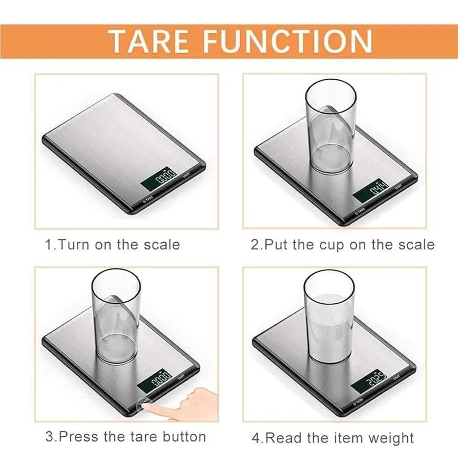 Función de tara: Permite restar el peso del recipiente para obtener solo el peso del contenido.