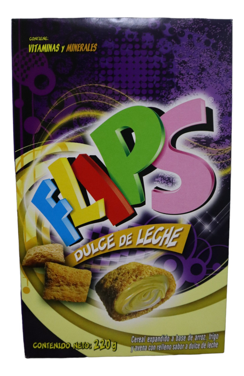 “Flips” es el nombre comercial de un tipo de cereal expandido que se encuentra hecho a base de arroz, trigo y avena. Tienen forma de almohadita y tradicionalmente vienen rellenos de chocolate, dulce de leche, o fresa. Su originalidad se basa en que pueden comerse con o sin leche, lo que permite que su delicioso sabor pueda ser disfrutado en cualquier lugar ya sea la montaña, la playa, la ciudad, o la intimidad del hogar.