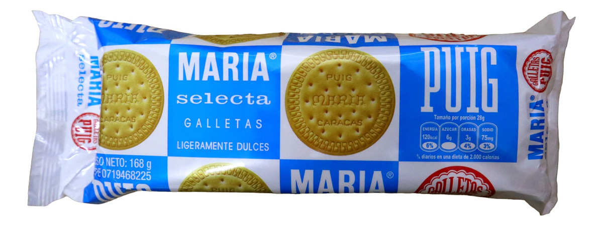 El paquete de las galletas MARIA selecta de PUIG es elegante y minimalista. El blanco y azul transmiten frescura y pureza, mientras que el rojo aporta un toque de pasión. La marca PUIG en letras grandes es un sello de calidad y confianza.
