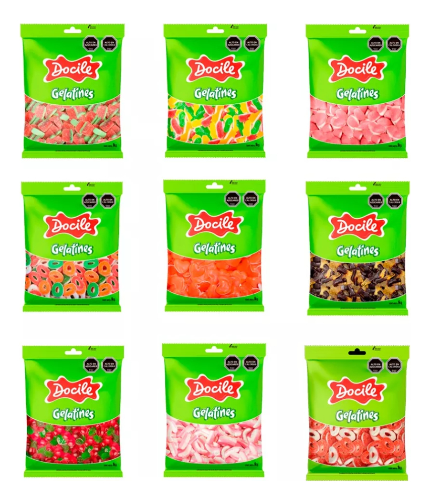 Aros de frutilla, Aros Manzana, Aros surtidos, Cereza, Coca cola, Coca cola acida, Corazones, Culebra Acida, Dientes de Vampiro, Fiesta, Frutilla, Gomitas Frambuesa, Huesito, Mora, Osita, Platano, Sandia, Tenis Acidos