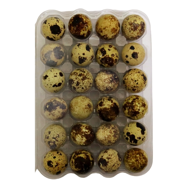 Presentación Impecable: La bandeja transparente contiene 24 huevos de codorniz dispuestos con precisión. Cada huevo se encuentra protegido en su propio espacio, lo que facilita su manejo y almacenamiento en el refrigerador.