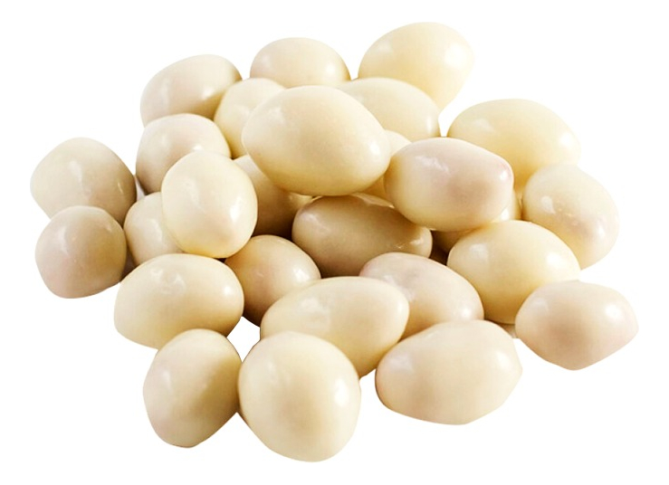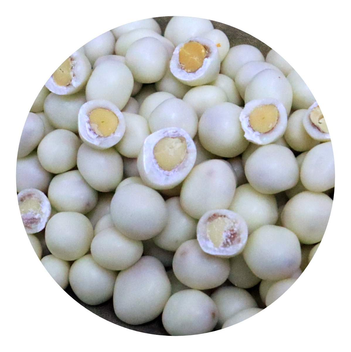 Visualmente, estos maníes son una obra de arte. El chocolate blanco forma una capa brillante y uniforme alrededor de cada maní, haciendo que parezcan pequeñas joyas. Puedes ver los detalles dorados del maní asomándose a través del chocolate, invitándote a dar el primer bocado.