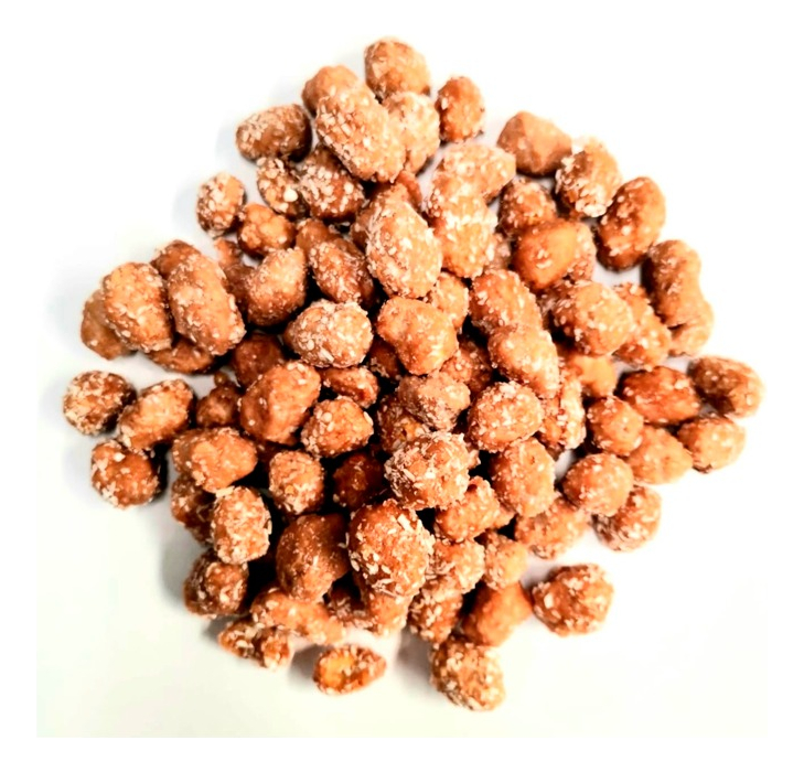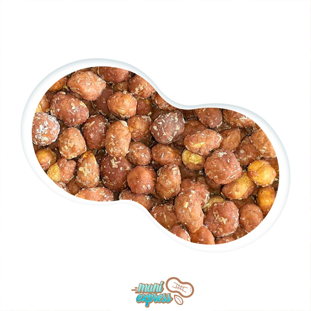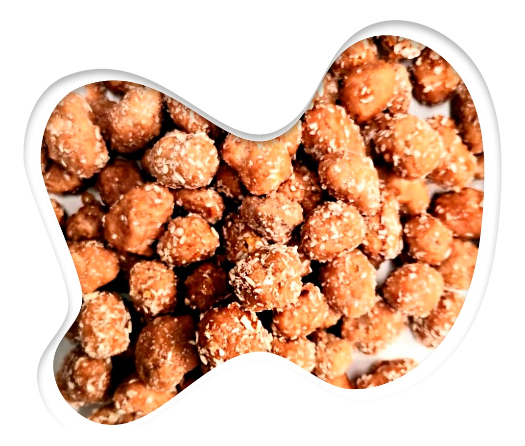 Mani confitado sabor a chocolate con coco rallado.