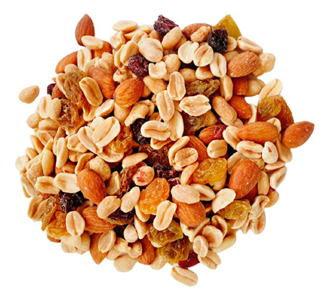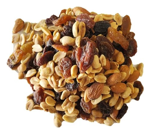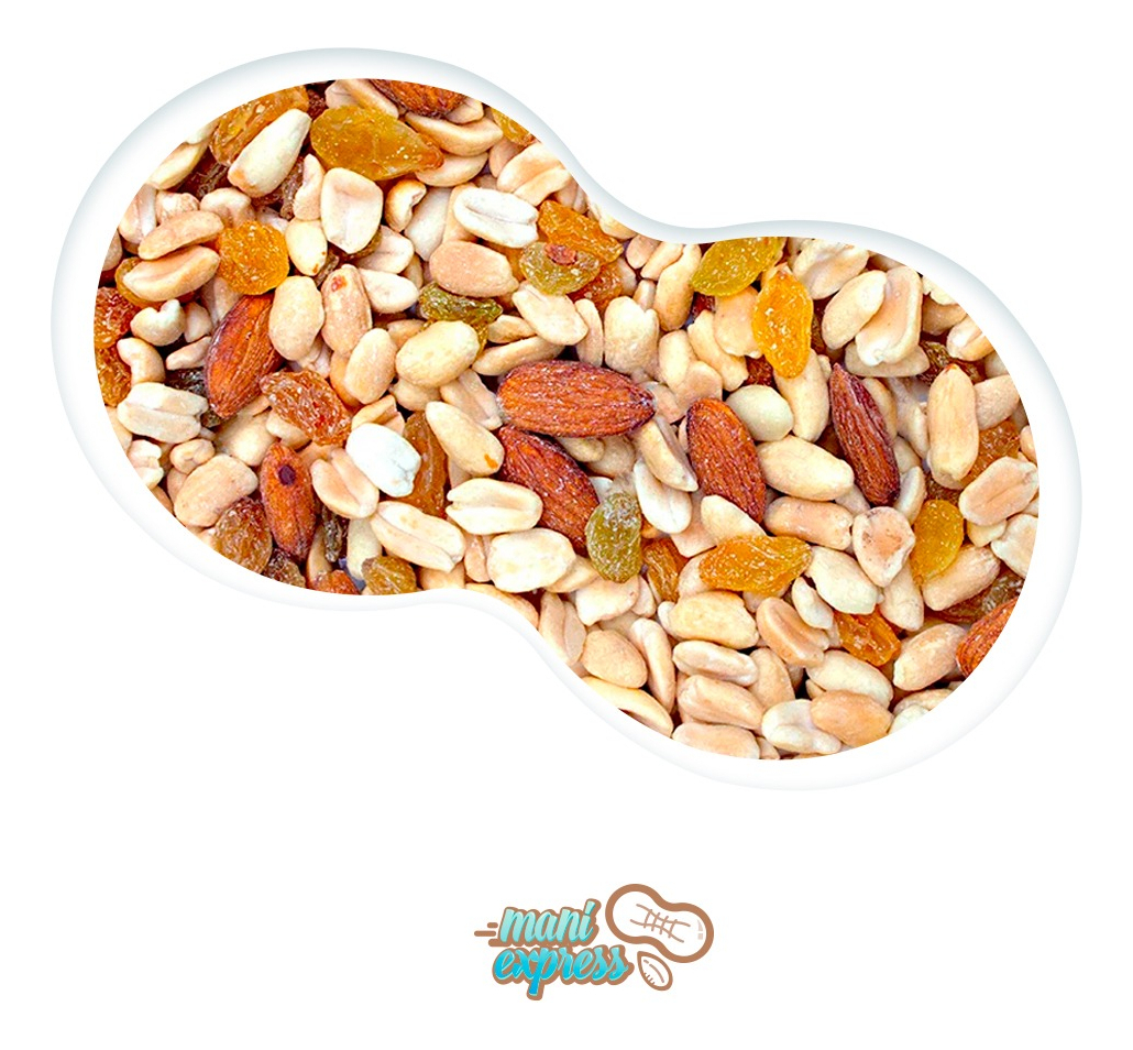Mix de mani, almendras, pasas rubias. Muy rico y se puede usar para pan de pascua