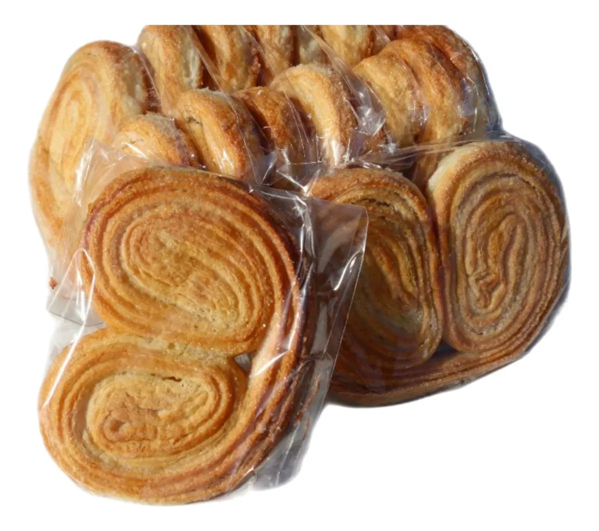 son pasteles hechos de hojaldre, caracterizados por su distintiva forma de corazón o mariposa con espirales visibles de las capas de la masa. Tienen una superficie dorada y caramelizada.