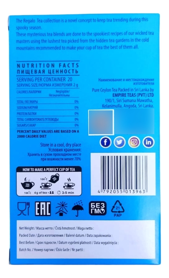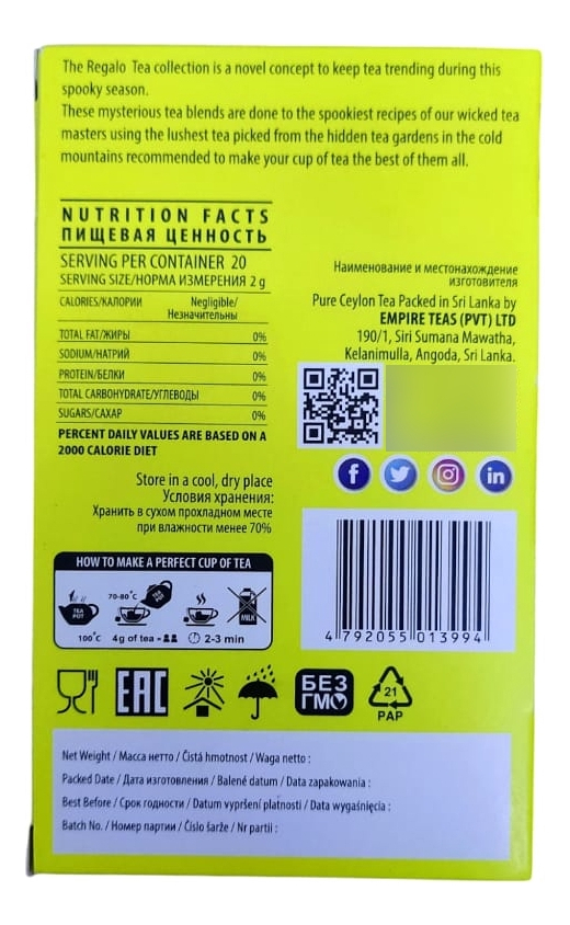 Sumérgete en la experiencia única que la marca Regalo ha creado con su exquisita colección de tés. Cada variedad ha sido seleccionada meticulosamente para ofrecerte lo mejor en sabor, calidad y beneficios para la salud. Desde la frescura revitalizante del té verde, pasando por la sofisticación del té negro Earl Grey, hasta la autenticidad del té negro puro de Ceilán, hay un té perfecto para cada momento.