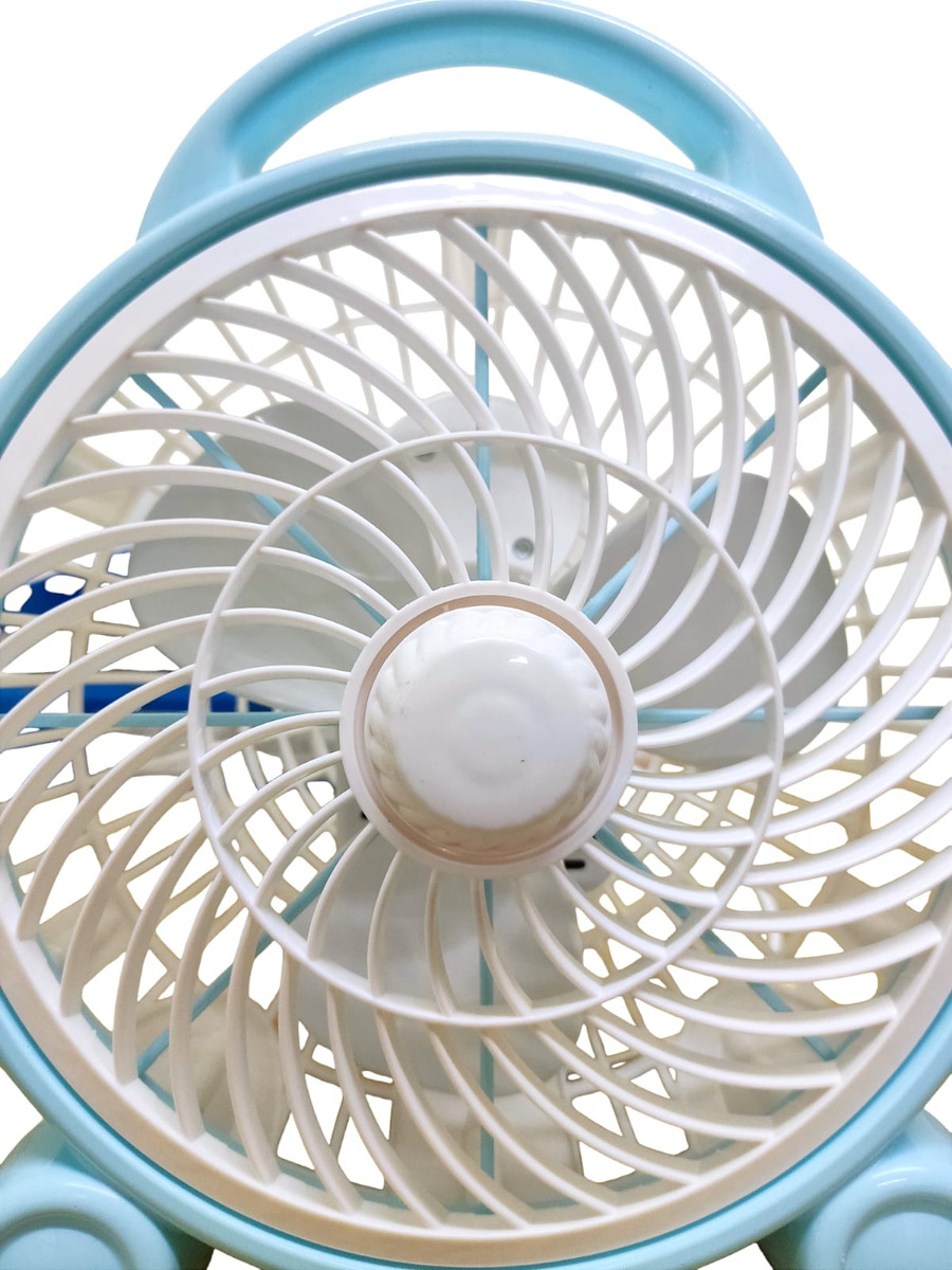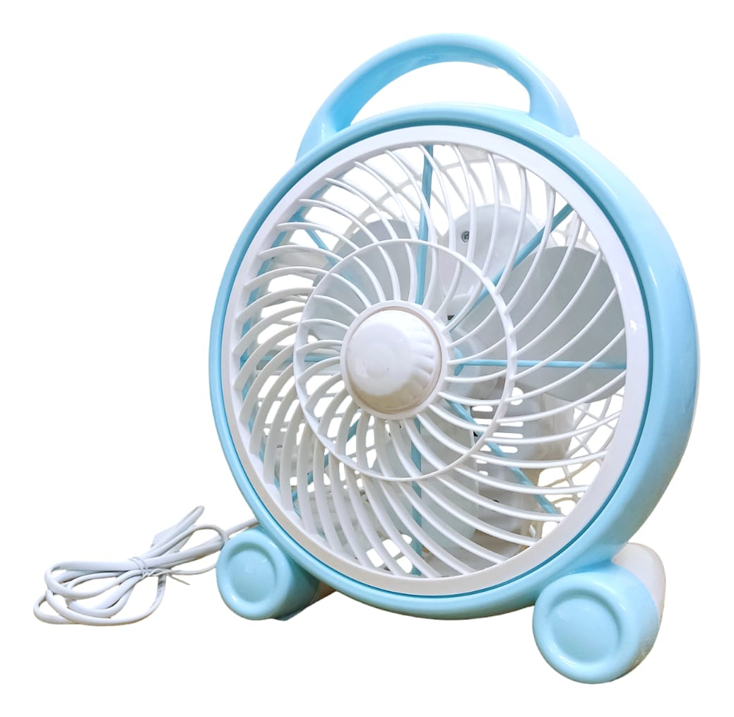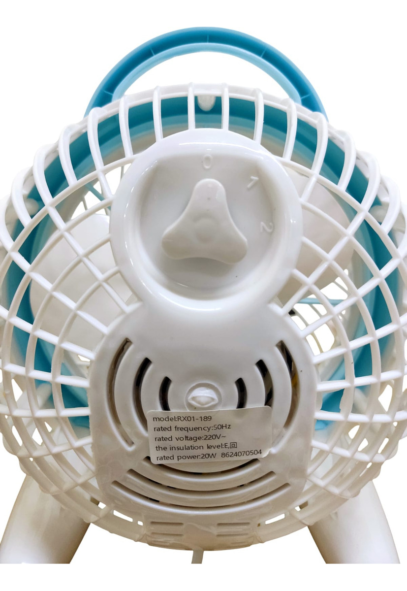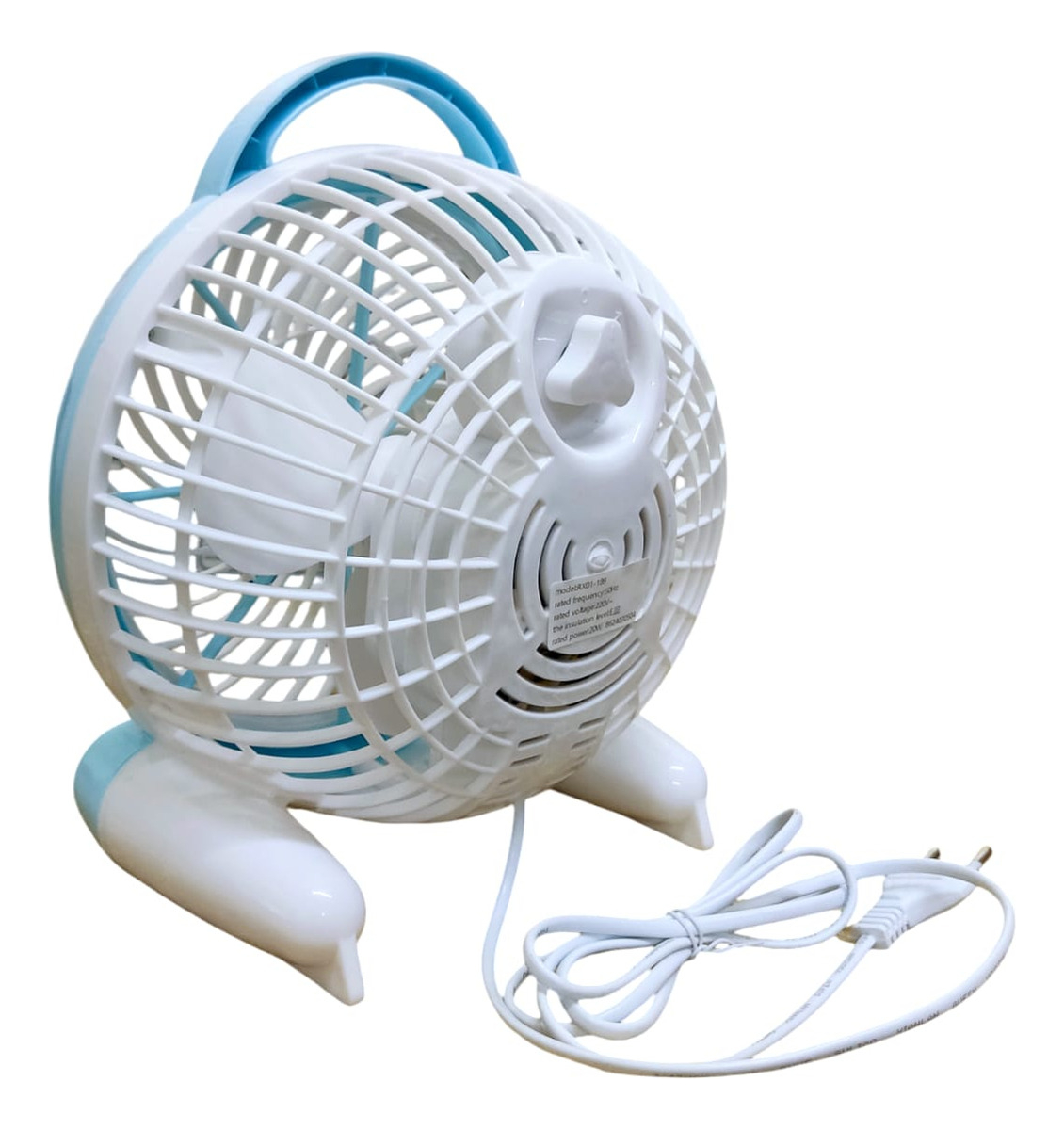Diseño Compacto y Moderno: Este ventilador de mesa, con su diseño blanco y azul, se adapta perfectamente a cualquier espacio pequeño, como escritorios o mesas de noche.